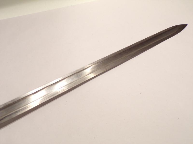 Sword bayonet for the 8 mm. Mannlicher-Berthier M1890 rifle. This is the 2nd pattern, and I think most interesting type of this style. It has a steel pommel and cross piece with wooden grips used from around 1905. The hooked quillon has been cut down, this was done from 1915 and two notched ground into the top of the blade, so it could be fitted to the rifle quicker. It has proof numbers on the quillon 32412 with an ‘AD’ prefix. It has a smaller type of muzzle ring, so this a converted bayonet for used by French Infantry during the great war. It comes with its original scabbard with matching numbers and its original leather frog, which is a scarce bit of kit. In superb condition, apart from some light use and signs of age, no damage to report. It measures 20. 75 inches long.