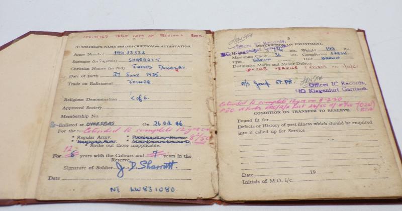 With these medals comes his original Soldiers Record and Pay book which confirms that 1443332 James Douglas Sharratt served with the Northumberland Fusiliers during the second world war, saw action during the Normandy landings where they fought as a premier machine-gun and support regiment and in various roles, including motor battalions, reconnaissance units, and infantry.