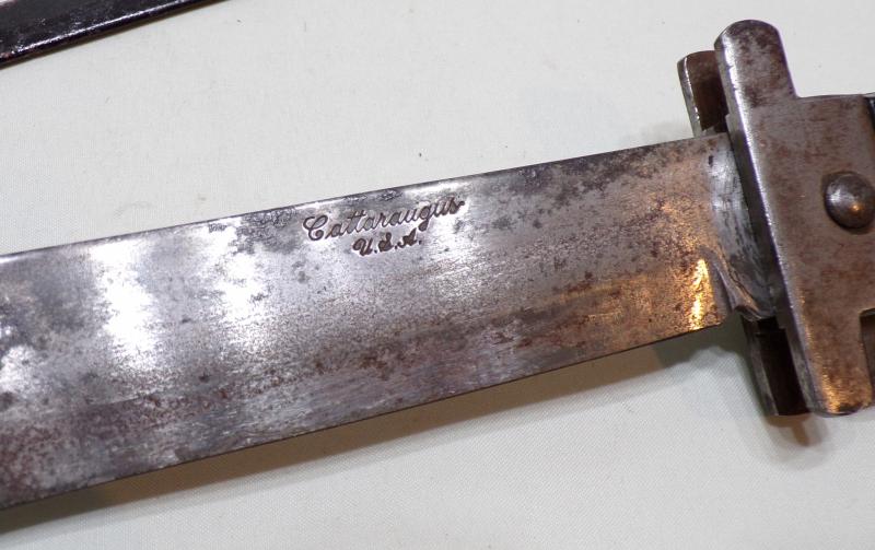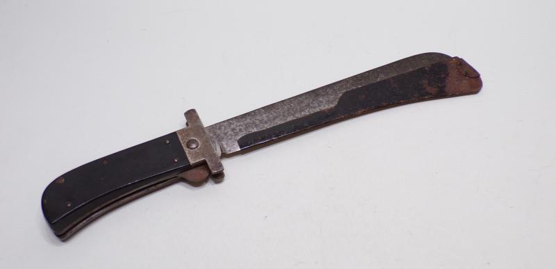 This type of machete was introduced in USAAF emergency kits B-2 and B-4 in 1942, replacing the model 18 Collins machete. This one is in good used condition, manufactured by Cattaraugus USA and comes with its original blade cover. It measures 11 inches when folded and 15.5 when open.