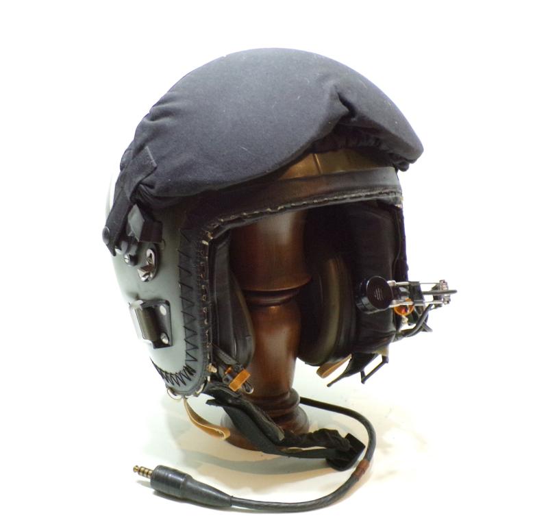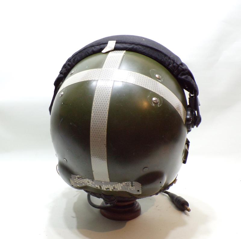 A super example of the late cold war Mk C3 flight helmet introduced in the 1970’s, fitted with NATO-pattern headsets and wiring, with integral microphone. This helmet also includes both its original clear and anti-glare visors and cover. It is in excellent condition with signs of light use and wear. Size medium.