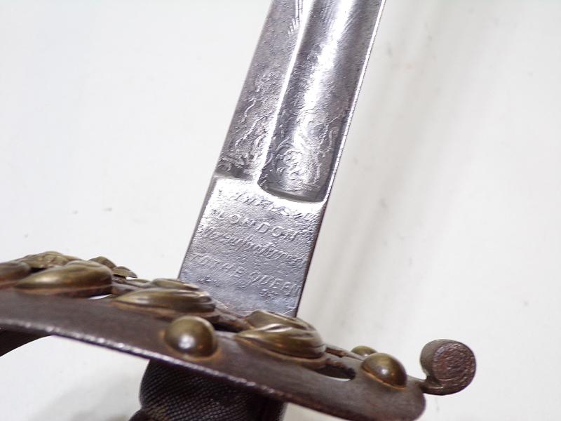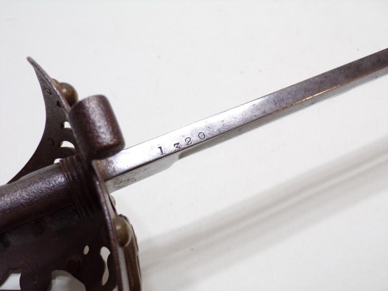 The 1874 officers State Sword of the 1st Lifeguards. Probably one of the oldest and most costly patterns of swords still used by the British army. This one is the post 1874 variant with the insignia for the 1st Lifeguards below queen Victoria’s crown. It is in totally untouched condition, so the hilt is covered with years old patination. The blade is clean and free from rust and pitting although a darkish tone. The ricasso is maker marked ‘Hawkes & Co London Manufacturer to the Queen’ with the royal warrant cypher above and the back of the blade has an issue number of 1320.